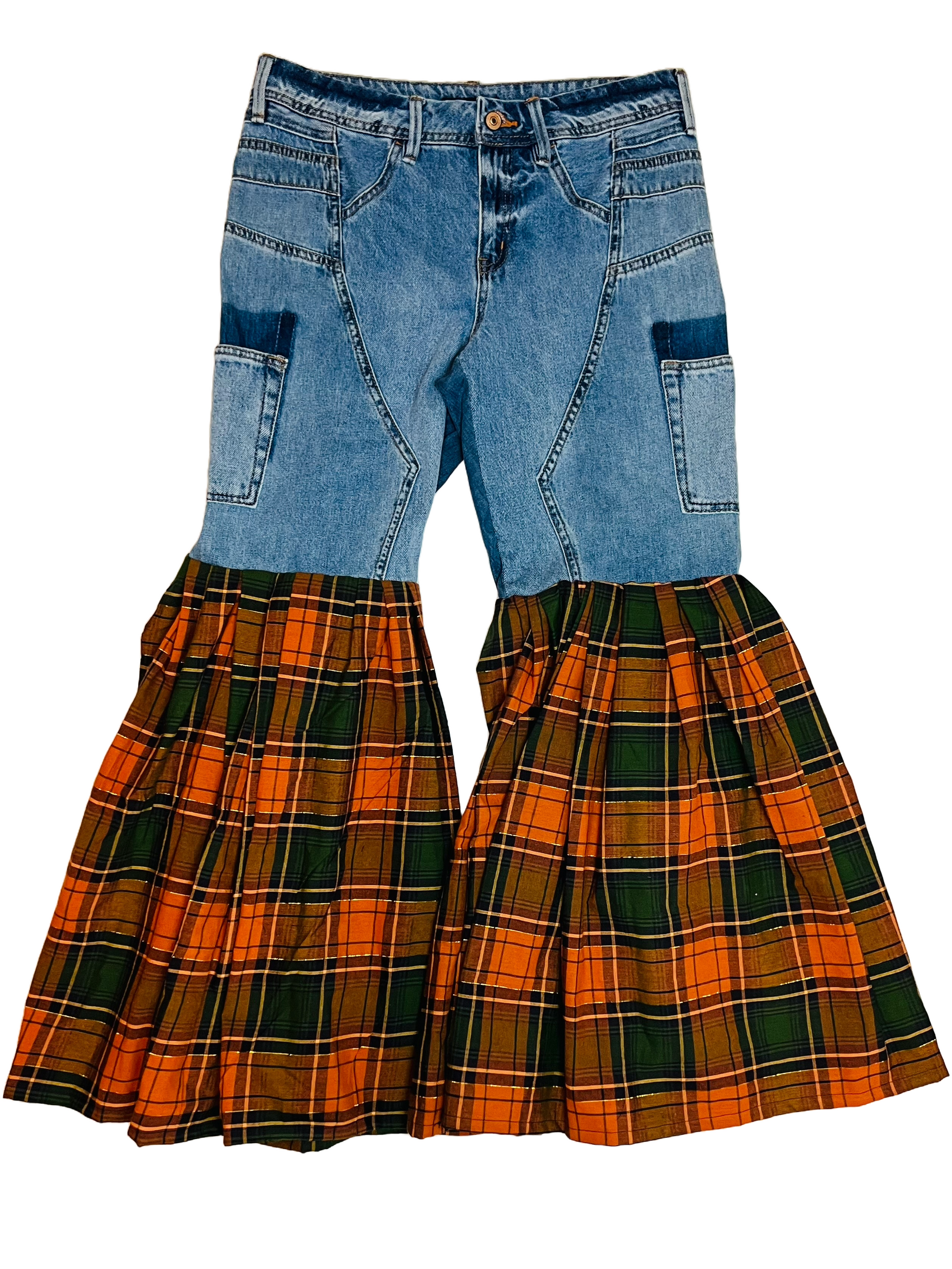 These Denim Green, Black and Orange Bell Bottom Pants are crafted with bold orange, black, and gold specs for a unique and eye-catching look. The soft denim material provides comfort while the bell bottom style adds a touch of retro flair. Perfect for making a stylish statement.